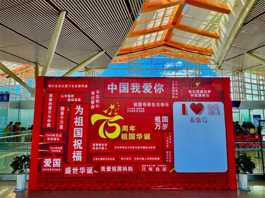 圖為拉薩貢嘎國(guó)際機(jī)場(chǎng)T3航站樓內(nèi)設(shè)置的愛(ài)國(guó)表白墻