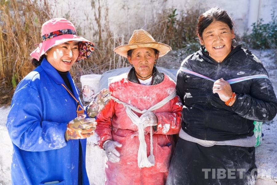 “布達(dá)拉宮外墻的白色涂料主體是來源于拉薩市當(dāng)雄縣羊八井和日喀則市仁布縣一帶的高嶺土,也就是我們通常所說的白灰。為了保證涂料的黏性和光澤度,在白灰兌上水后,我們會加入牛奶、白糖、牛骨膠、植物膠等配料。這些配比都是由長期從事布達(dá)拉宮文物保護(hù)的工匠來操作的,每種原材料的比例都是經(jīng)過匠人們長期的經(jīng)驗(yàn)積累所總結(jié)出的最佳配比方案。我們經(jīng)常會遇到群眾在幫忙的過程中在配比好的涂料中加入自己隨身攜帶來的牛奶等物,我們能夠理解群眾善良質(zhì)樸的心情,但其實(shí)改變了涂料配比后原有的黏度、光澤度都會改變,是不利于文物保護(hù)的。”邊巴瓊達(dá)說布達(dá)拉宮管理處每年都會在粉刷季向群眾和游客科普文物保護(hù)知識,希望群眾和游客在參與粉刷之時能夠遵守秩序,共同保護(hù)好這一文化遺產(chǎn)。