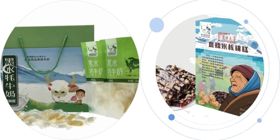 有了加工企業的支持,楊斐開始著手打造“阿斐牌”黑水牦牛奶條奶片和“阿斐牌”血糯米核桃糕。他發揮自己的設計專長,為這些產品打造了獨特的品牌形象。同時,他還聯系了東西部對口援建黑水的國企,爭取到了后續的產業投入。