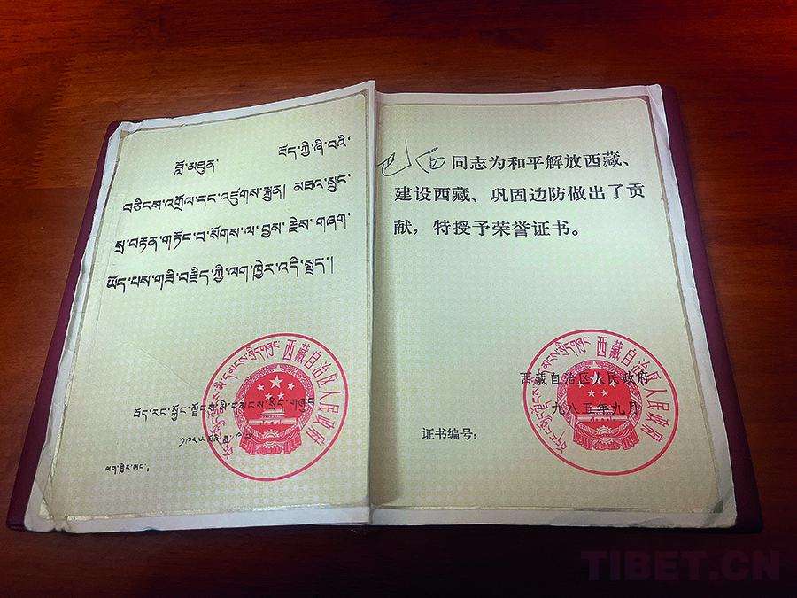 圖為西藏自治區人民政府授予巴西老人的證書