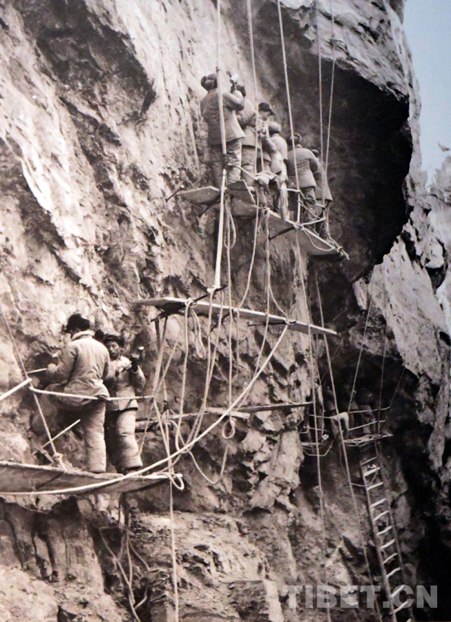 圖為“背著公路進西藏”的十八軍戰士在懸崖上修筑川藏公路 唐召明翻拍