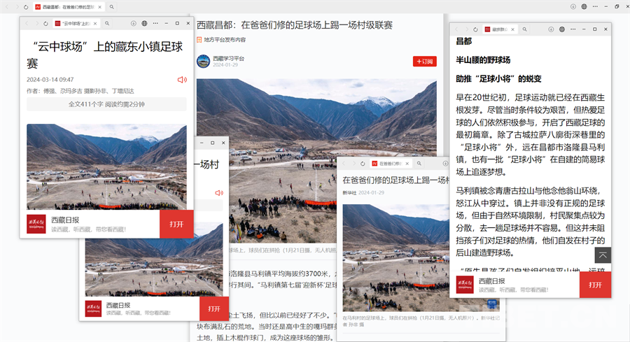今年一月,延續(xù)七屆的馬利鎮(zhèn)足球“迎新杯”在“爸爸們修建的足球場(chǎng)”開賽的消息備受關(guān)注。一時(shí)間,《在爸爸們修建的足球場(chǎng)上踢一場(chǎng)村級(jí)聯(lián)賽》《“云中球場(chǎng)”上的藏東小鎮(zhèn)足球賽》《半山腰上的野球場(chǎng) 助推“足球小將”的蛻變》多篇稿件在China Daily、新華社、西藏日?qǐng)?bào)、學(xué)習(xí)強(qiáng)國(guó)、昌都發(fā)布等平臺(tái)紛紛亮相,引起不少關(guān)注。