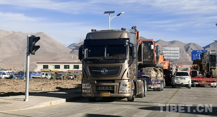 圖為卡車將大量挖掘機等工程機械運往西藏自治區日喀則市定日縣 攝影:劉莉