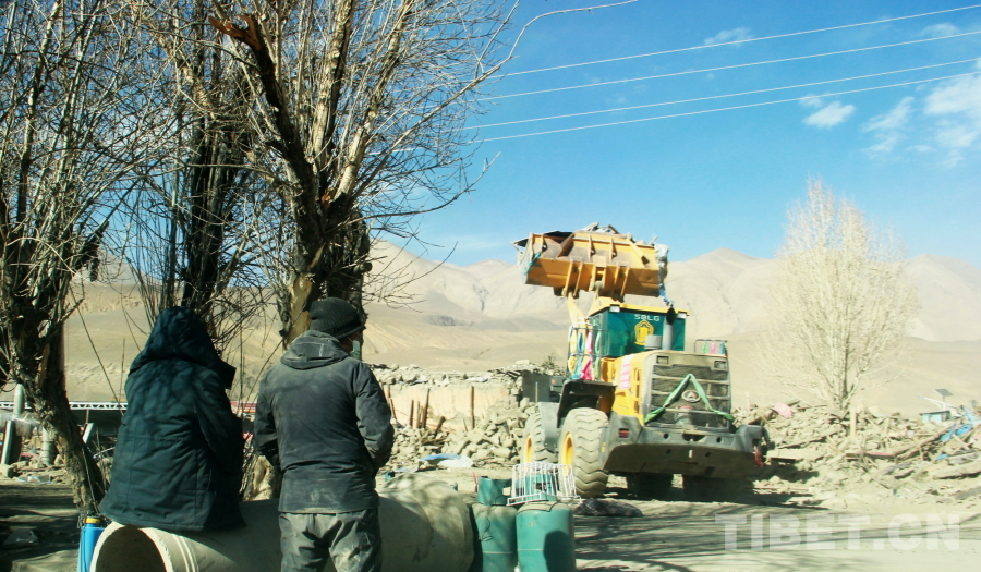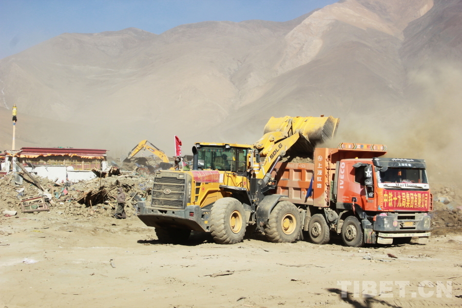 圖為地震重災區西藏自治區日喀則市定日縣長所鄉森嘎村危房除險現場,裝載機正在向渣土車傾倒建筑垃圾 攝影:劉莉