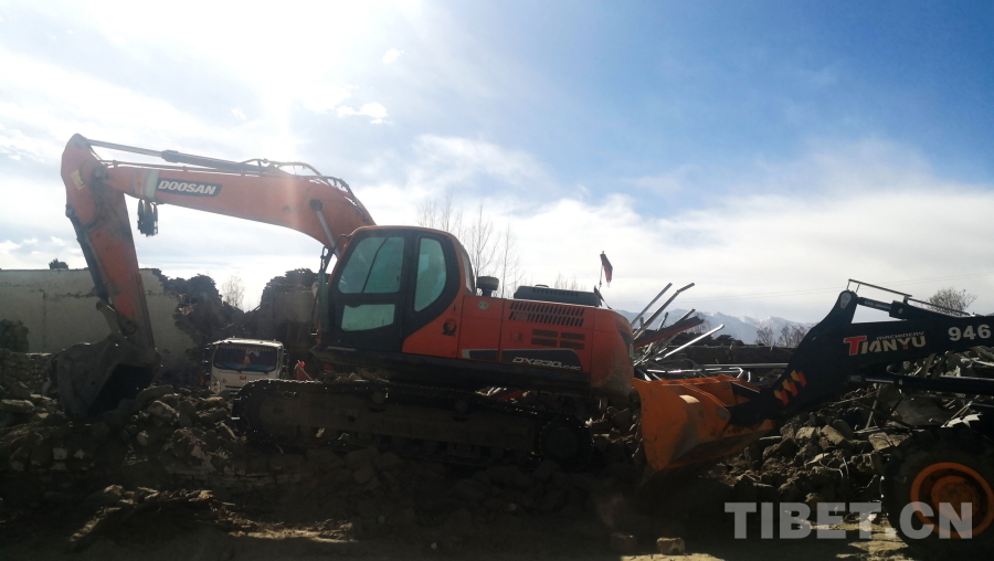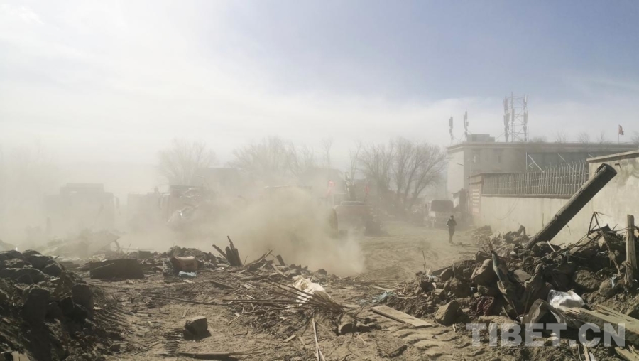 圖為地震重災區西藏自治區日喀則市定日縣長所鄉除險現場,畫面中右側的危房、建筑已完成除險 攝影:劉莉