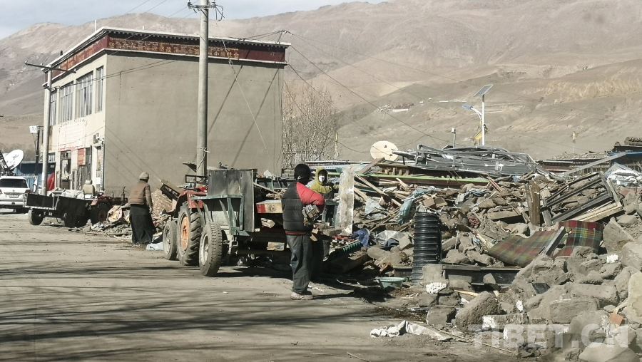 圖為地震重災區西藏自治區日喀則市定日縣長所鄉除險現場,村民在已完成除險的地方搜集尚可再次利用的物資,旁邊未受到嚴重損壞的房屋被保留下來 攝影:劉莉