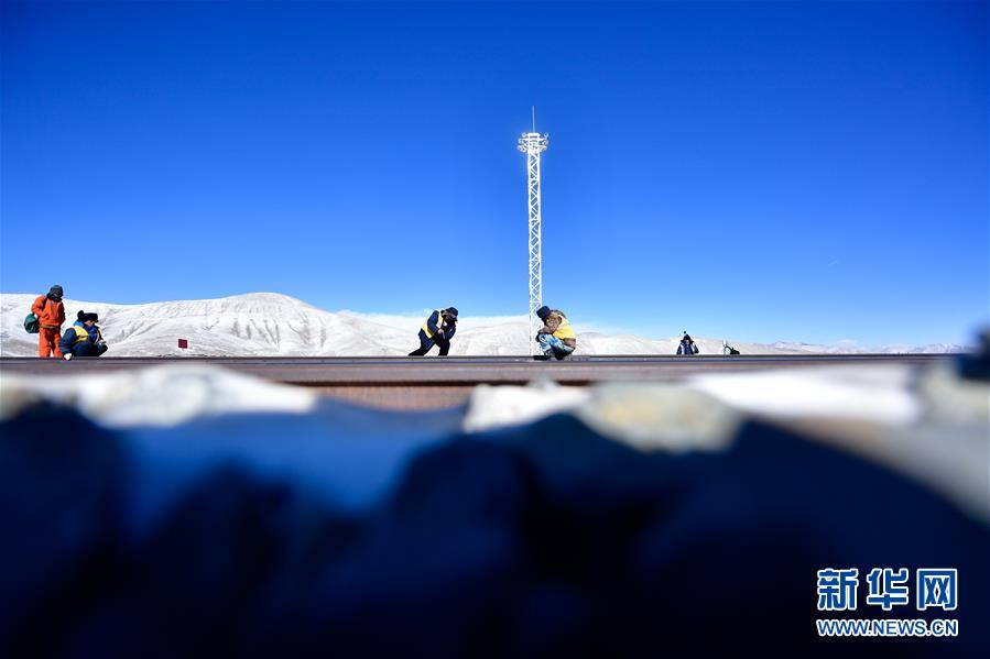 1月11日,在青藏鐵路望昆站附近,于本蕃(左一)和工友們?cè)谑┕で斑M(jìn)行安全檢查。新華社記者 張龍 攝