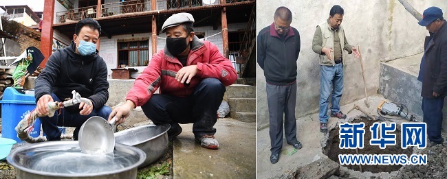 拼版照片:左圖為4月21日,勒阿村駐村第一書(shū)記張金利(左)在村民屠海榮家查看自來(lái)水管情況(新華社記者陳斌攝);右圖為2019年10月18日,張金利(中)指導(dǎo)村民挖自來(lái)水防凍井(新華社發(fā))。