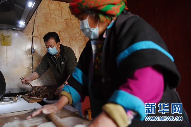 勒阿村駐村第一書(shū)記張金利(左)幫著村民屠魯列一起做午飯(4月21日攝)。 新華社記者 陳斌 攝