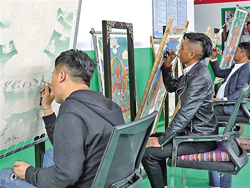 囊謙縣乃嘉瑪唐卡文化藝術有限公司里,在非遺傳承大師桑買的指導下,一批年輕的農牧民唐卡繪畫藝人在成長,同時也拓寬了他們增收致富的渠道。申維祖 攝