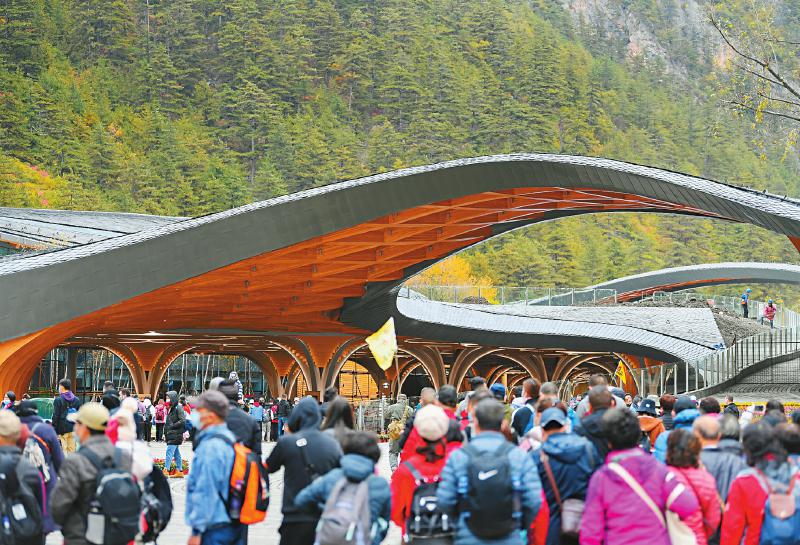 以景推城。在九寨溝,處處可見“生態優先”的痕跡——生態擋墻間的動物通道,游客腳下的生態棧道、景區外的旅游環保法庭……