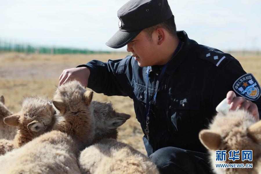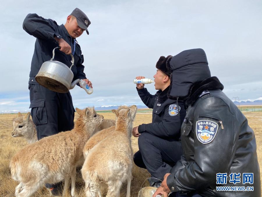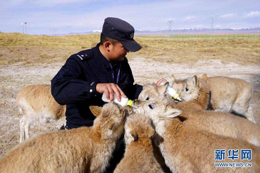 可可西里巡山隊員鄧海平給藏羚羊幼仔喂奶(12月6日攝)。新華社記者 藍翔 攝
