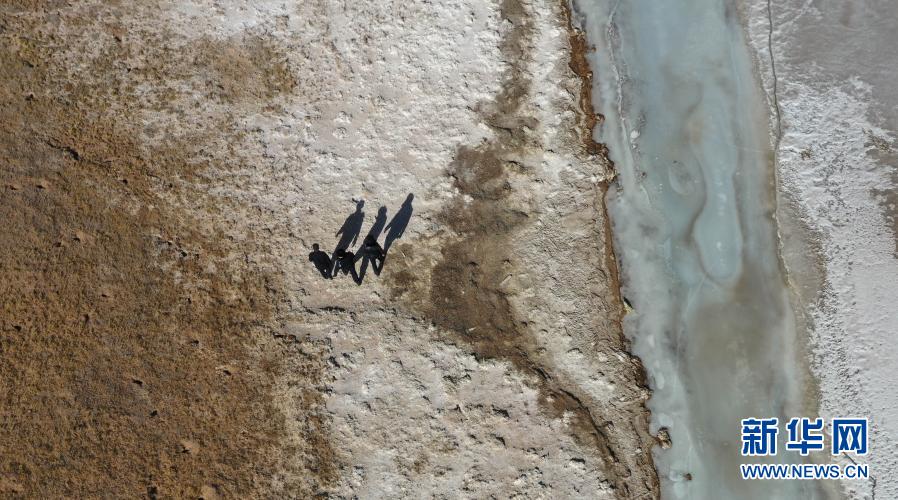12月7日,站長趙新錄(中)與隊友鄧海平(左)、達才在可可西里索南達杰保護站管護區域內巡查(無人機照片)。新華社記者 王艷 攝