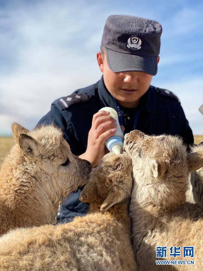 12月7日,可可西里巡山隊員達才在給藏羚羊幼仔喂奶。新華社記者 藍翔 攝