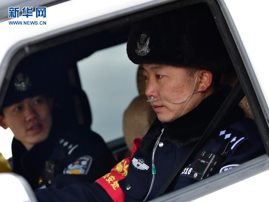 2月5日,沱沱河站派出所副所長蒲海春(右)在巡線途中出現(xiàn)高原反應后緊急吸氧。新華社記者 張龍 攝