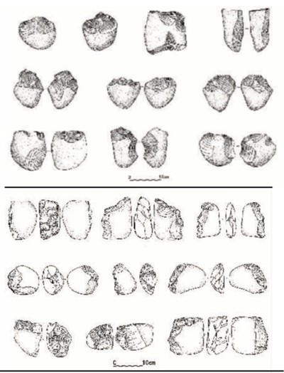將塘達遺址石器(下圖)與井水灣遺址石制品比對發(fā)現(xiàn),塘達與井水灣遺址石器工業(yè)均就地取材,以遺址附近河灘礫石為主體原料,石核以雙面剝片和單面剝片模式為主,原料開發(fā)利用強度適中,不見盤狀石核等更為復雜和具有預制性的石核剝片模式。石制品尺寸較大,工具類型中存在典型的刮削器和砍砸器,不見手斧和手鎬等大型切割工具,均屬于東亞典型石核—石片石器工業(yè)。