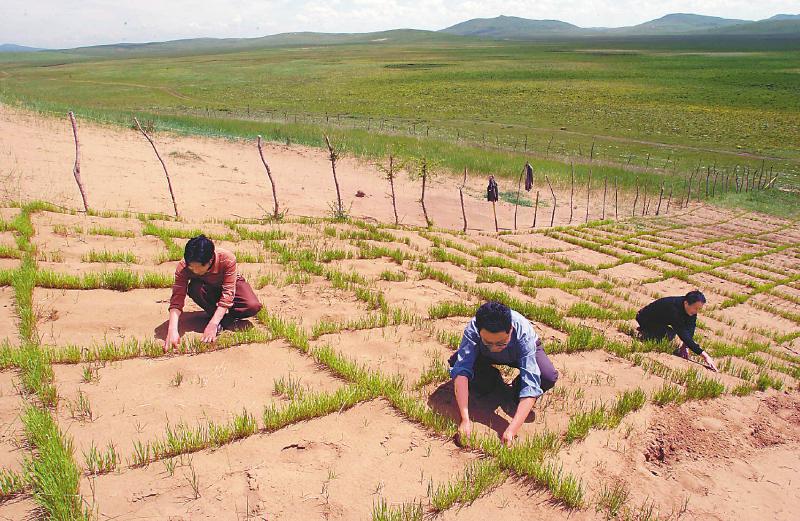 2007年4月8日,當?shù)厝罕娫谌魻柹w縣麥溪鄉(xiāng)和轄曼鎮(zhèn)實施防沙治沙項目。尹鋼 攝