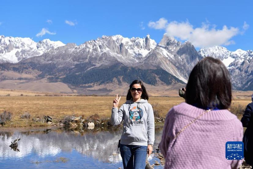 游客在四川甘孜巴塘縣措普溝景區內拍照留念(10月24日攝)。新華社記者 胥冰潔 攝