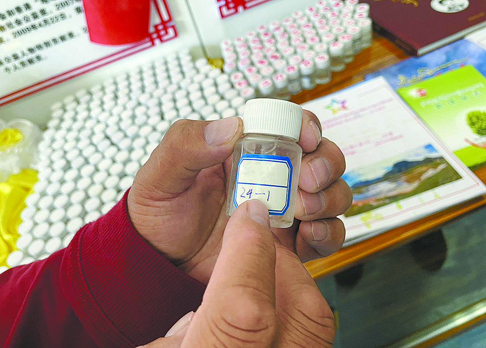 巴洪加羅展示監測水源時所取的水樣。李慶玲 攝