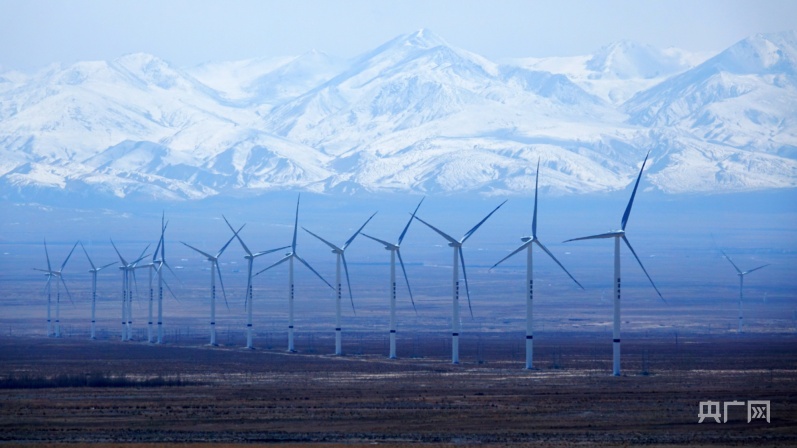 雪山下的風力發電機組(央廣網記者 張海東 攝)