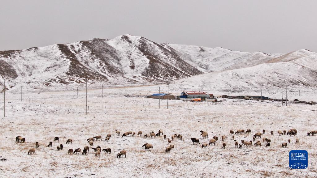 3月31日,青海省黃南藏族自治州河南蒙古族自治縣,一群歐拉羊在雪后的草原上吃草(無人機照片)。 新華社記者 王艷 攝