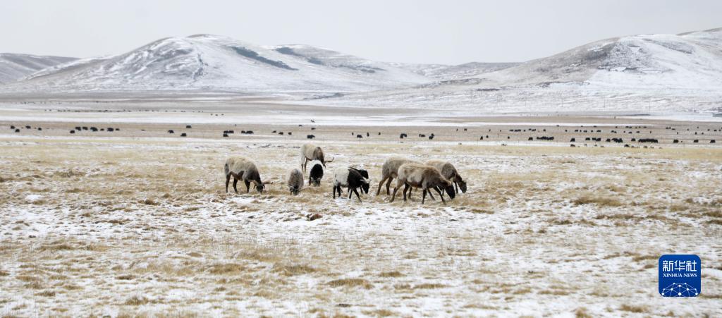 3月31日,青海省黃南藏族自治州河南蒙古族自治縣,一群歐拉羊在雪后的草原上吃草。 新華社記者 王艷 攝