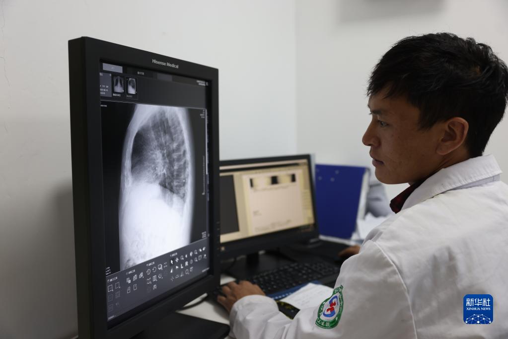6月13日,在青海省果洛藏族自治州甘德縣青珍鄉中心衛生院,醫生才讓巴丁正在查看X光片。新華社記者 李寧 攝