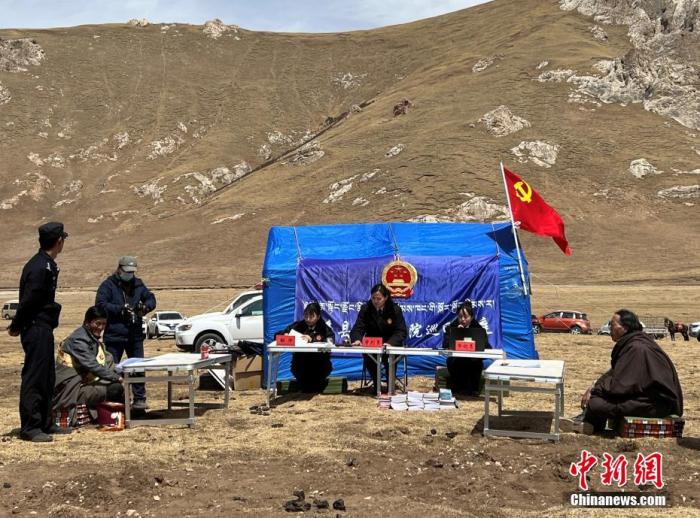資料圖為“馬背法庭”工作人員在牧民帳篷旁辦案。 中新社發 瑪多縣人民法院 供圖