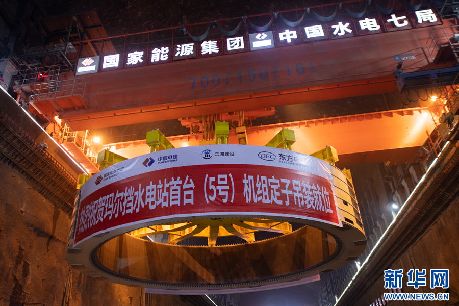 6月30日,瑪爾擋水電站首臺機組定子吊裝作業現場。新華網 潘彬彬 攝