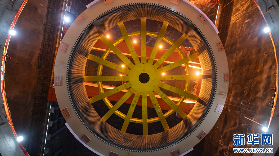 6月30日,瑪爾擋水電站地下廠房內,工作人員正在進行首臺機組定子吊裝作業。新華網 潘彬彬 攝