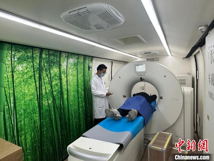 一名牧民在青海省果洛藏族自治州瑪沁縣人民醫院的“移動醫療一體車”完成CT檢查。同濟大學附屬上海市第四人民醫院供圖