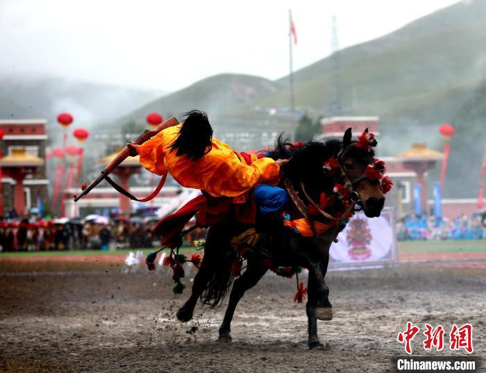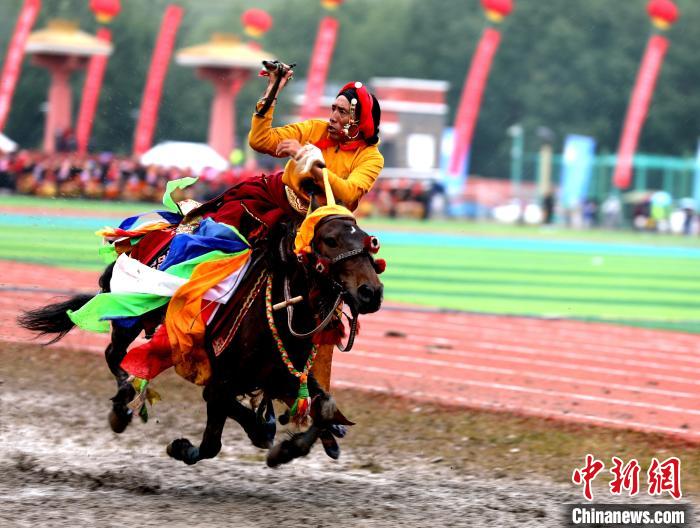 圖為玉樹傳統賽馬會現場的馬術表演。薛蒂 攝