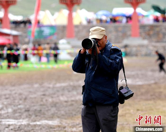 圖為西藏攝影師阿旺洛桑在玉樹傳統賽馬會現場拍攝。薛蒂 攝