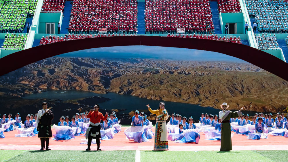 8月1日,當地群眾在海南藏族自治州成立70周年慶祝大會上表演。新華社記者 解統強 攝