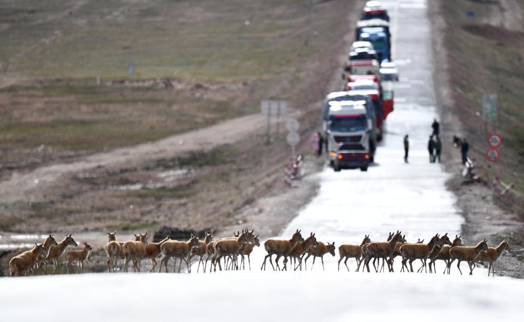 一群待產雌性藏羚羊正在通過青藏公路前往可可西里卓乃湖產仔(5月29日攝)。新華社記者 張宏祥 攝
