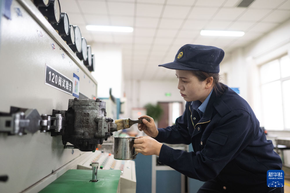 10月12日,在中國鐵路青藏集團有限公司西寧東車輛段制動班組,馬婷在120閥試驗時涂抹檢漏劑。新華社記者 張龍 攝