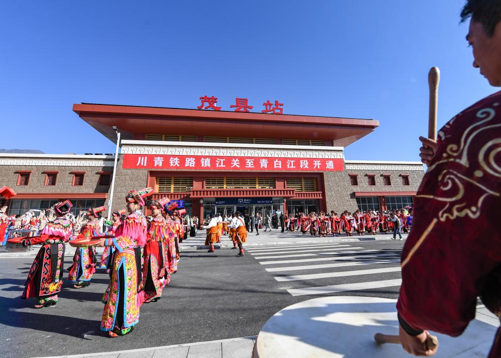 11月28日,在川青鐵路茂縣站,當地各族群眾在站前廣場慶祝鐵路開通運營。 新華社記者 王曦 攝