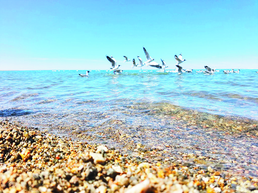 初冬時(shí)節(jié)的青海湖,寧?kù)o內(nèi)斂,水波浩渺,飛鳥翔集,景色如畫。