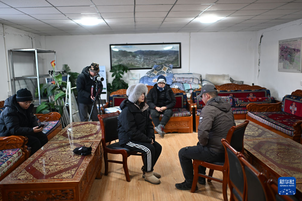 記者在索南達杰保護站宿舍內采訪巡山隊員(1月19日攝)。新華社記者 張宏祥 攝
