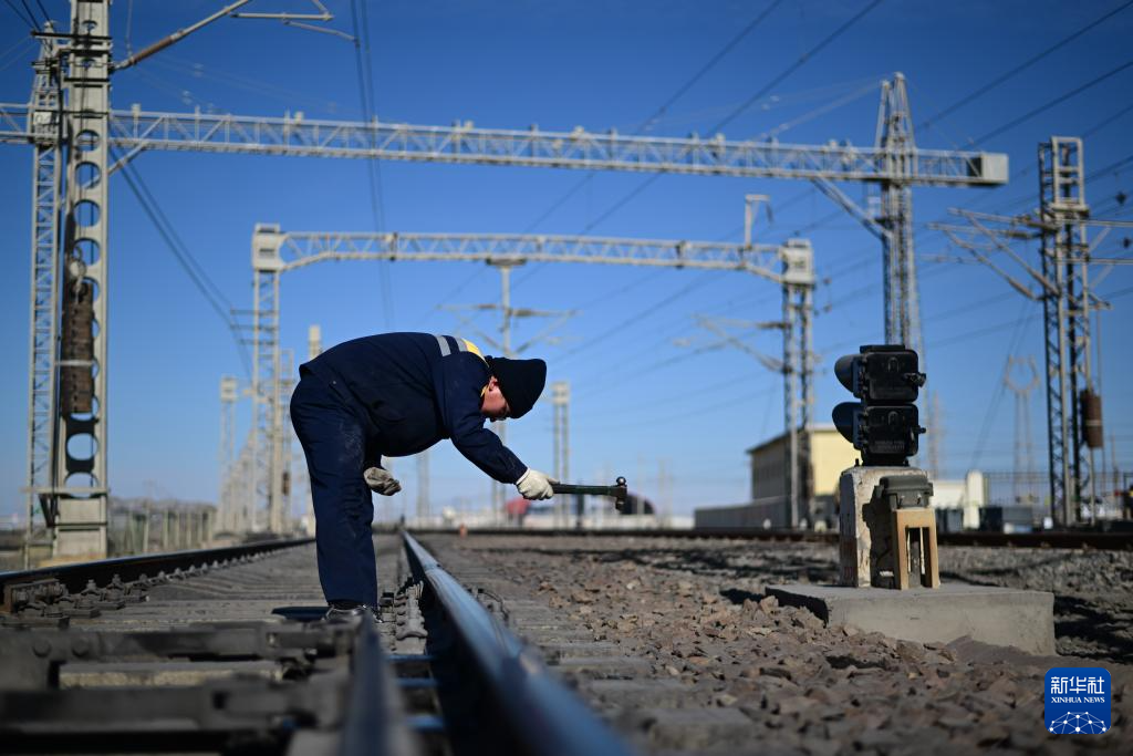 1月29日,格爾木電務段格爾木東信號車間察爾汗信號工區職工何江東在檢查引接線。新華社記者 張龍 攝
