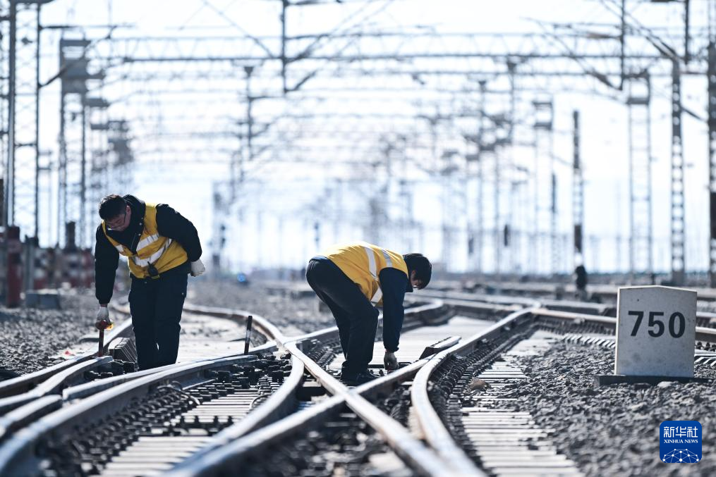 1月29日,格爾木電務段格爾木東信號車間察爾汗信號工區職工楊正宏(左)和胡進海在對察爾汗站道岔進行檢修作業。新華社記者 張龍 攝