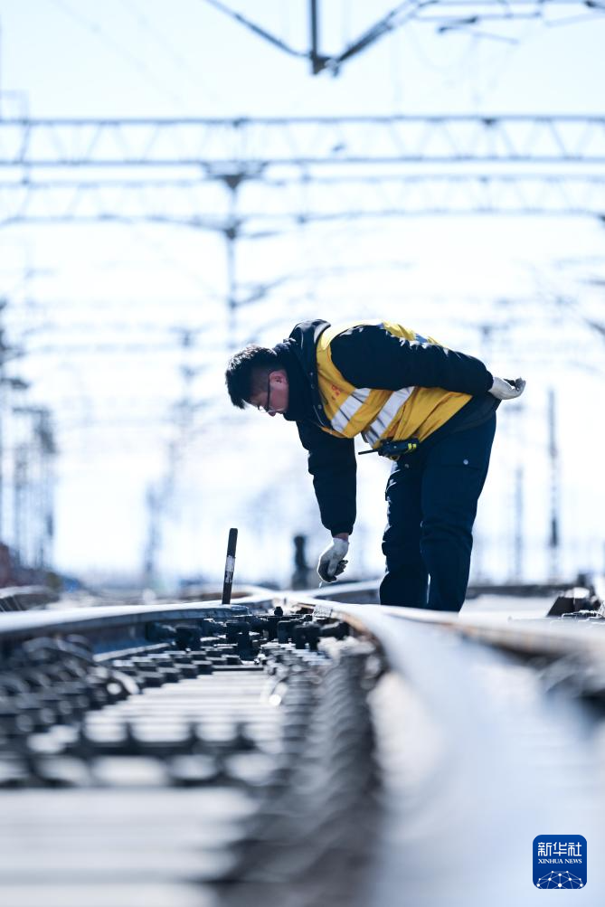 1月29日,格爾木電務段格爾木東信號車間察爾汗信號工區職工楊正宏在對察爾汗站道岔進行檢修作業。新華社記者 張龍 攝