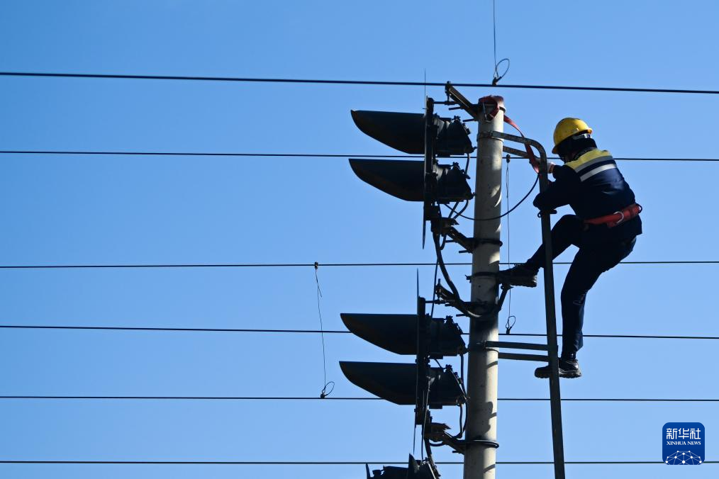 1月29日,格爾木電務段格爾木東信號車間察爾汗信號工區職工何江東在高柱信號機上檢查信號機安裝螺絲是否緊固。新華社記者 張龍 攝