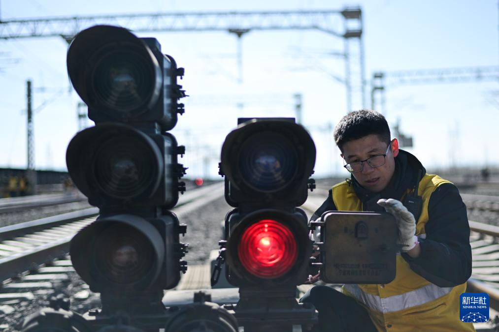 1月29日,格爾木電務段格爾木東信號車間察爾汗信號工區副工長張世鐸在指揮調整信號機顯示。新華社記者 張龍 攝
