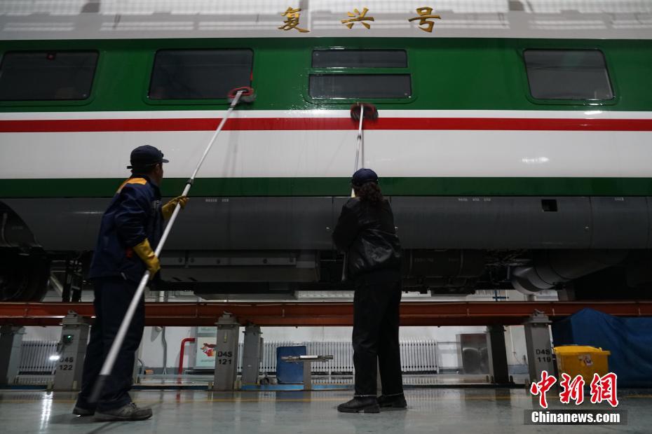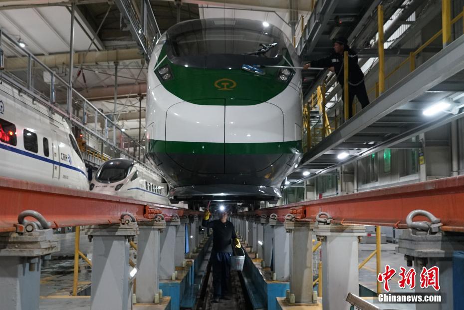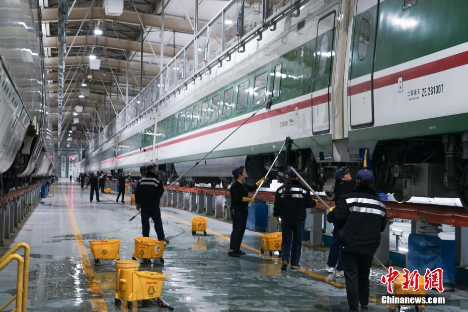 1月30日晚,在青藏鐵路公司西寧車輛段動車運用車間,工作人員在無電作業時進行動車清潔。中新社記者 馬銘言 攝