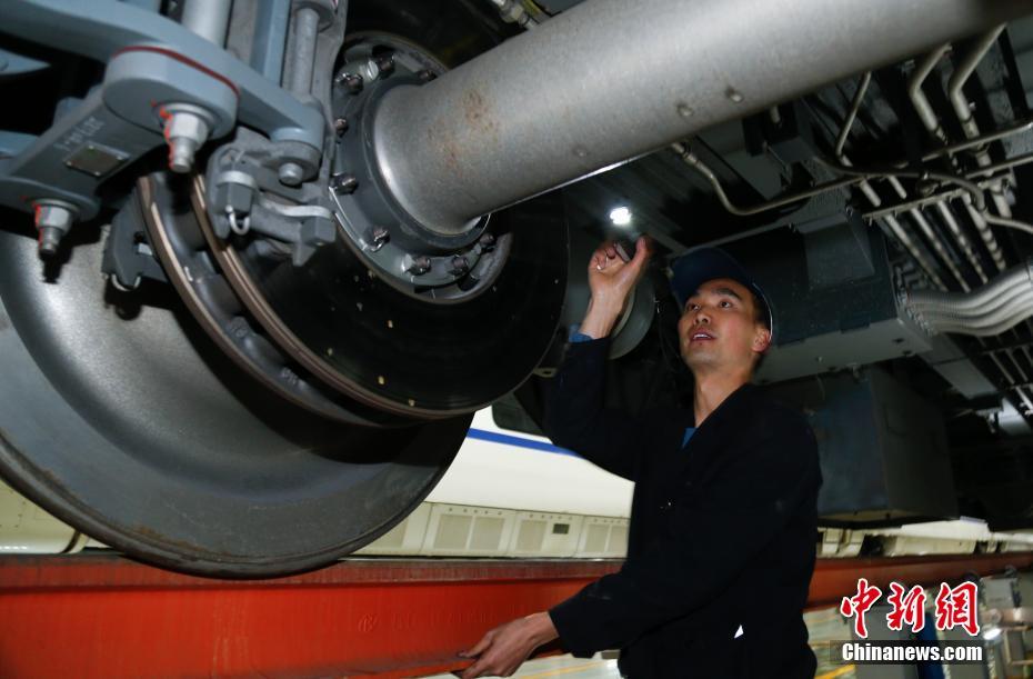 1月30日晚,在青藏鐵路公司西寧車輛段動車運用車間,地勤機械師在無電作業時進行動車組走行部關鍵部位的檢修。中新社記者 馬銘言 攝