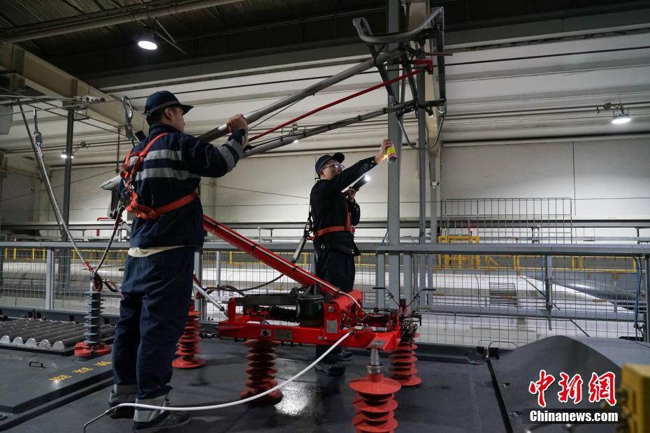 1月30日晚,在青藏鐵路公司西寧車輛段動車運用車間,地勤機械師在無電作業時進行車頂受電弓的功能檢查及測漏檢測。中新社記者 馬銘言 攝