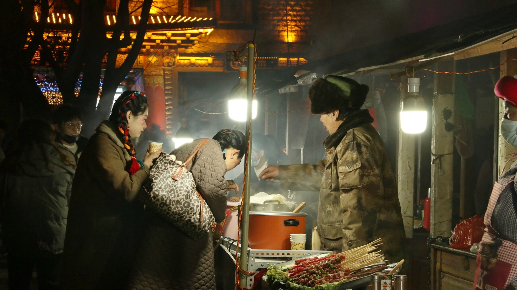 夜幕降臨,游客們在獨克宗古城拍照、購物,爬山、觀景,玩得十分愜意。