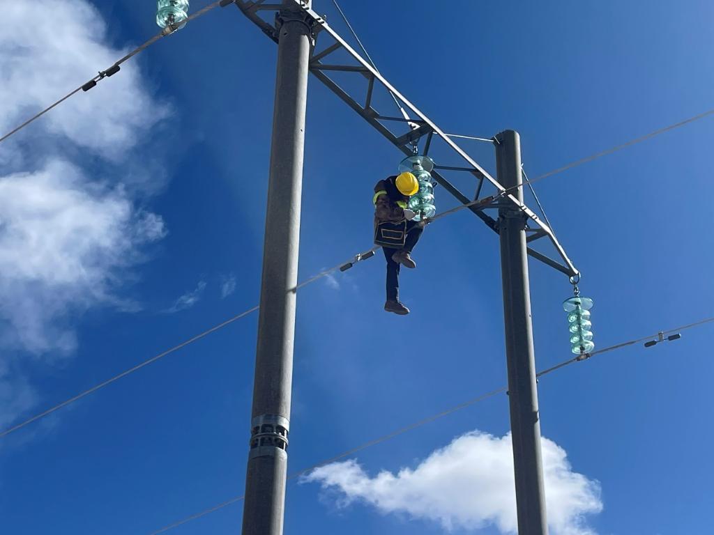 9時30分,隨著指揮調(diào)度中心下達(dá)斷電指令,軌道車正式進(jìn)入檢修區(qū)段。“全副武裝”的隊員陸續(xù)下車,有的接掛地線,有的測量數(shù)據(jù),有的登高作業(yè)……現(xiàn)場叮叮當(dāng)當(dāng)?shù)淖鳂I(yè)聲和電臺里傳來的指揮聲此起彼伏。