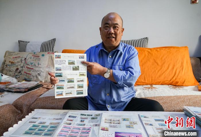 圖為徐超展示其收藏的中國郵政為紀(jì)念青藏鐵路全線建成通車,于2006年7月1日發(fā)行的一套紀(jì)念郵票中的其中一枚名為《列車駛過唐古拉山》的郵票。 馬銘言 攝